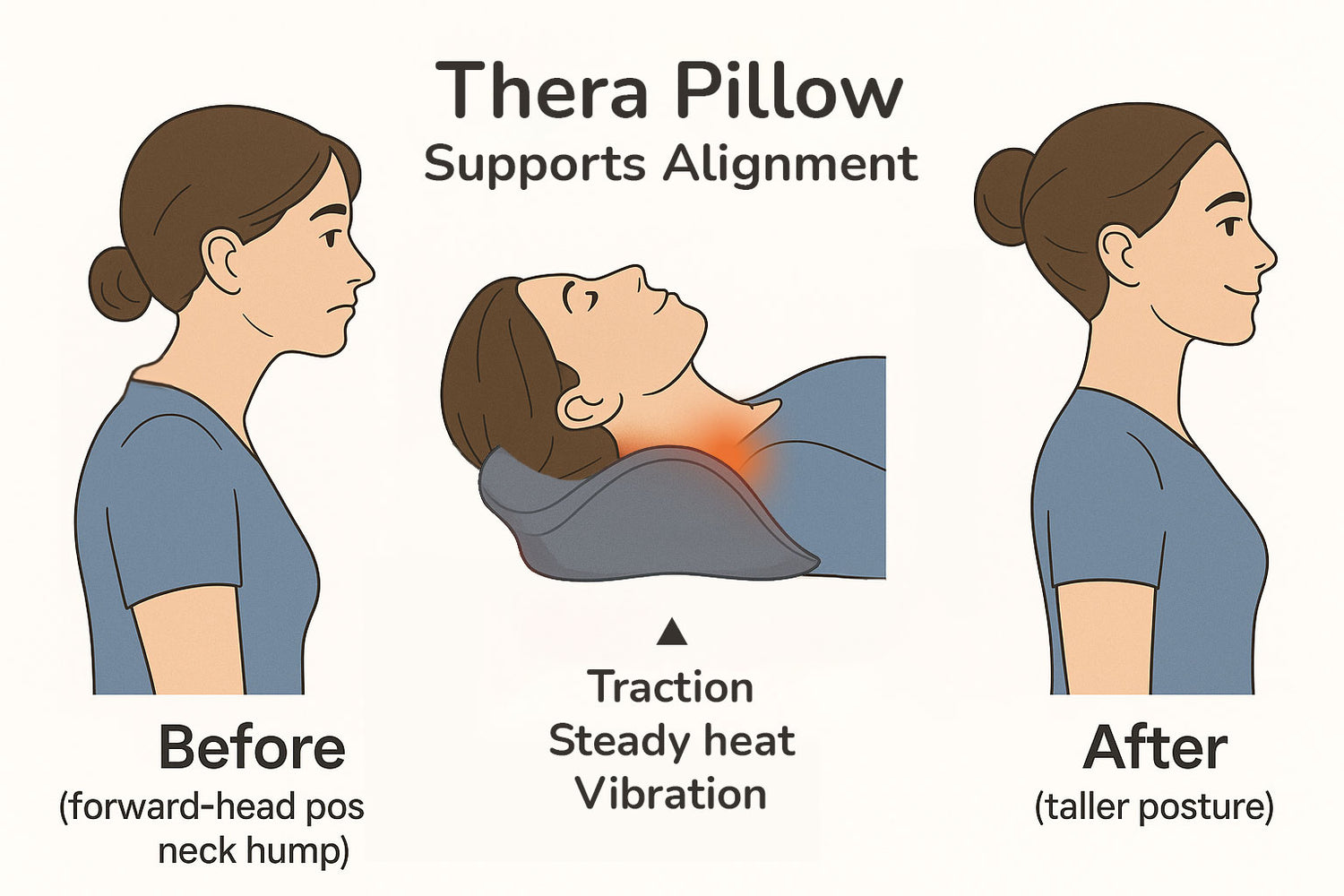 In any case, combined stimulation of the neck with Thera Pillow™ — gentle cervical traction with a precise 26° lift (supports alignment and helps reduce compression), steady therapeutic heat at 40–50°C (relaxes rigid musculature), and multi-mode vibration (helps release trigger points) — can help reduce the visibility of the neck bump and support a more upright posture with consistent use.