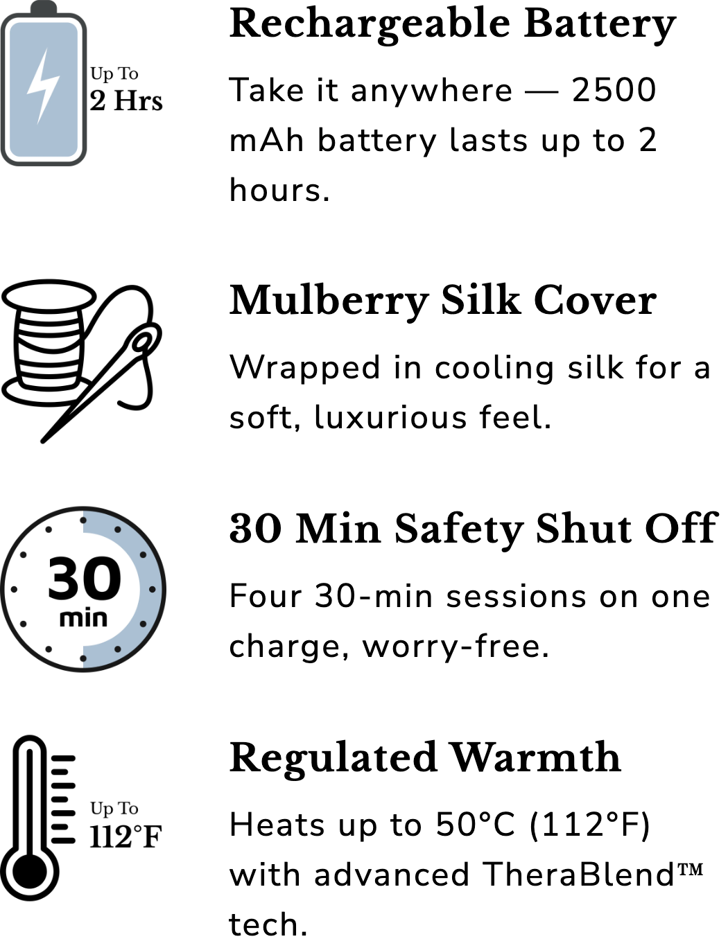 - Safety features include auto-shutoff (at 30 min. intervals) and temperature regulation (limited to 50° C)