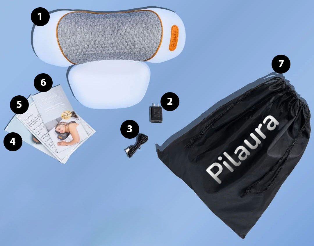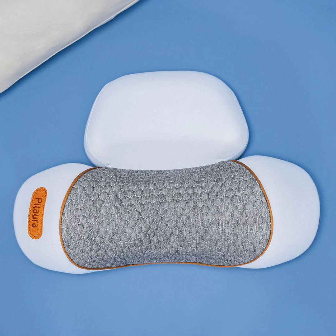 Thera Pillow utilizes traction, heat, and vibration massage combined with an ergonomic contour memory foam design.