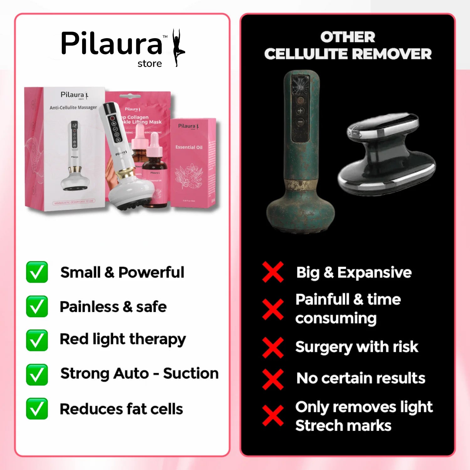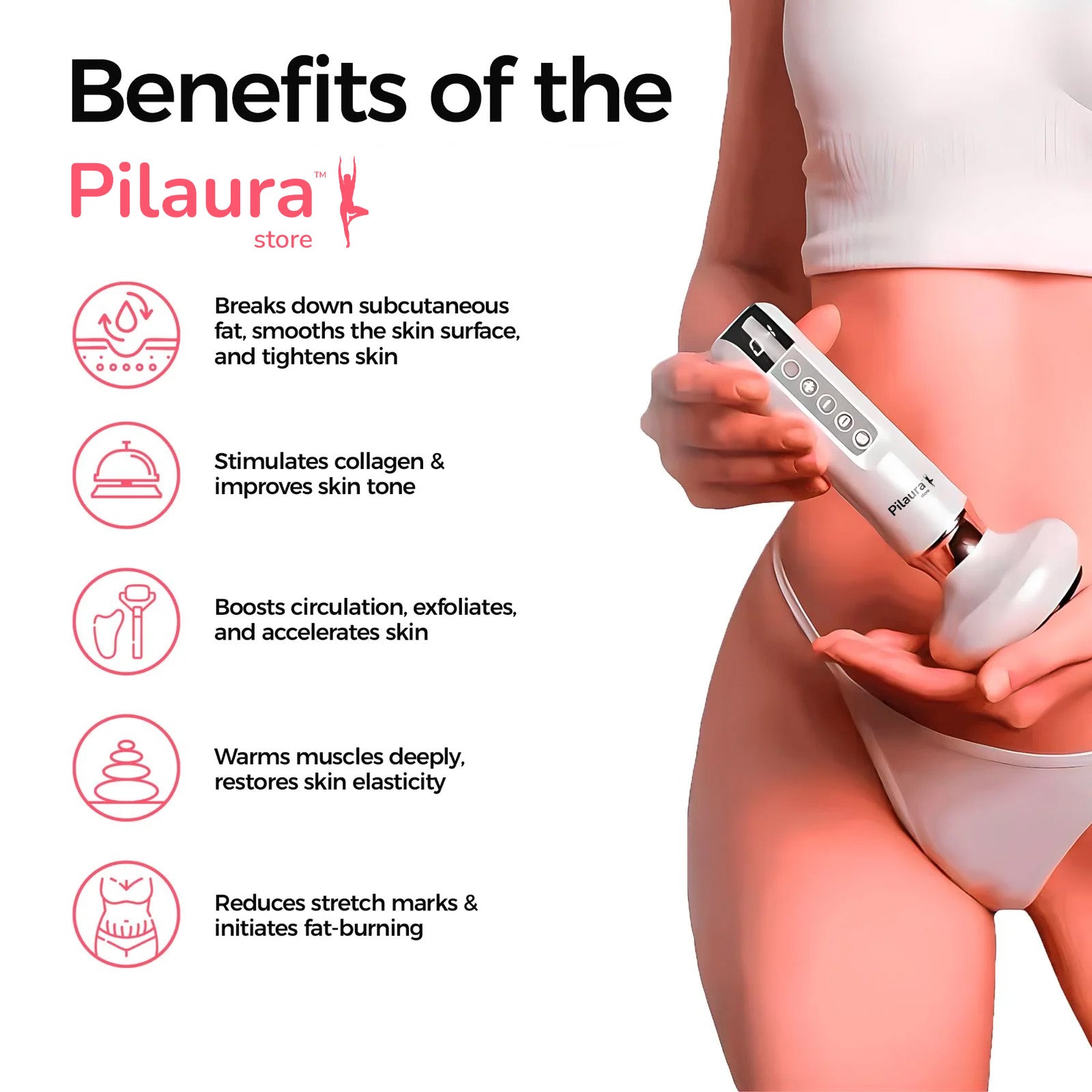 Pilaura’s Advanced Anti-Cellulite Massager combines professional-grade treatments into one easy-to-use, portable device — built for real results at home.