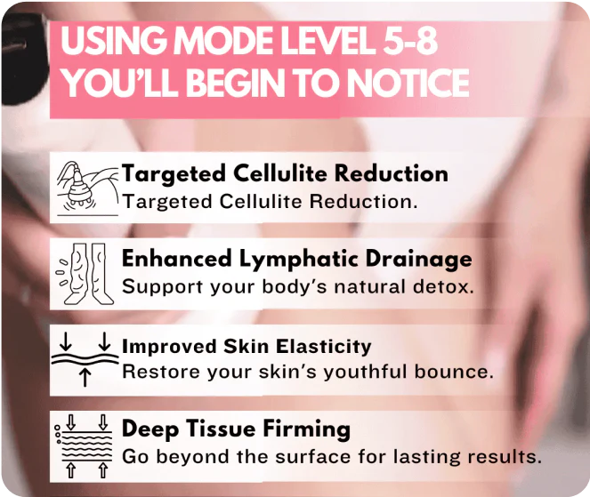 Levels 5 through 8 deliver a more targeted and powerful massage. You'll start to see cellulite reduction, improved skin elasticity, and deep tissue firming, while supporting natural lymphatic drainage for visible, lasting results.