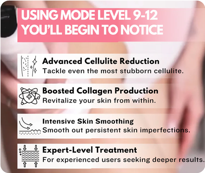 Experienced users who need intensive treatment. These settings deeply penetrate the skin to significantly reduce the appearance of cellulite, stimulate collagen production, and smooth out even the most persistent skin irregularities